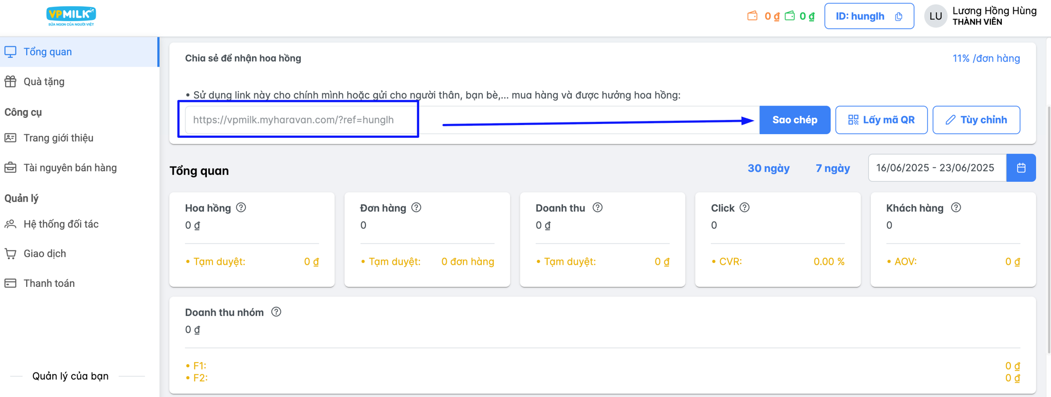 Sau khi đăng nhập vào hệ thống, bạn click vào mục cấu hình sau đó copy link giới thiệu mua hàng của mình để gửi cho bạn bè hoặc share lên các phương tiện Social, sms, email,…