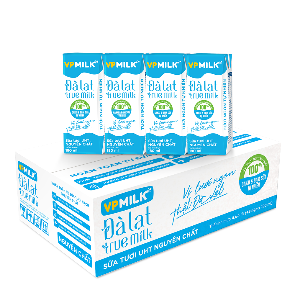 Sữa tươi tiệt trùng VPMilk Đà Lạt True Milk được sản xuất từ 100% sữa bò tươi nguyên chất tại cao nguyên Đà Lạt - nơi có điều kiện thiên nhiên lý tưởng giúp đàn bò phát triển khỏe mạnh, cho ra nguồn sữa chất lượng cao. Nhờ đó, sản phẩm mang đến hương vị sữa thơm ngon tự nhiên, tươi mát đặc trưng, không thể nhầm lẫn với bất kỳ vùng nguyên liệu nào khác.